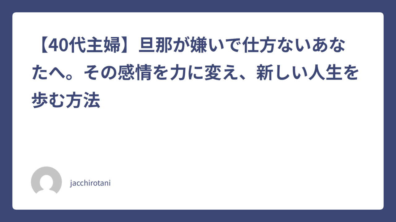 「どうしてこの人と結婚してしまったんだろう…」 40代を迎え、ふとした瞬間に、旦那様に対して強い嫌悪感を抱いてしまうことはありませんか?長年連れ添ってきたはずなのに、今では顔を見るのも、同じ空気を吸うことすら苦痛に感じる。そんなやるせない思いを抱えながらも、経済的な不安や子どものこと、世間体を考えて、ただひたすら我慢の日々を送っている方も少なくないでしょう。
